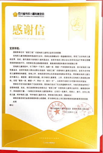 2025年12月,宜宾学院向四川省残疾人福利基金会宜宾助残专项基金捐赠10001.56元,善款将全额定向用于宜宾“爱星工程”公益帮扶工作,以实际行动践行高校社会责任,为残疾儿童康复、教育及生活保障注入力量,切实传递温暖关怀。