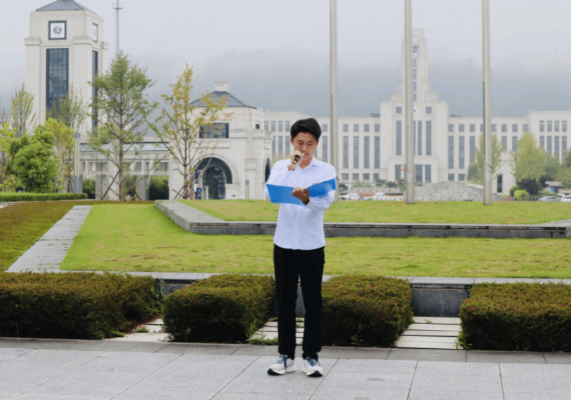 礼毕,宜宾学院教师教育学院钟磬音、数理学院宁益磊作为学生代表走上发言台。钟磬音以“八秩荣光”为引,回顾革命年代先辈们浴血奋战守护国旗的峥嵘岁月,她表示:“每一面五星红旗的升起,都承载着无数先烈的信仰与期盼,我们应当永远铭记这份沉甸甸的历史。”宁益磊则将目光投向新时代,结合当代建设者的实干故事,说道:“从航天突破到科技攻坚,当代中国人正以行动为国旗增辉,这是我们青年一代的榜样与方向。”两位代表共同号召同学们将个人理想融入祖国发展大局,真挚的情感与铿锵的誓言引发全场共鸣,让“强国复兴有我”的种子深深扎根。