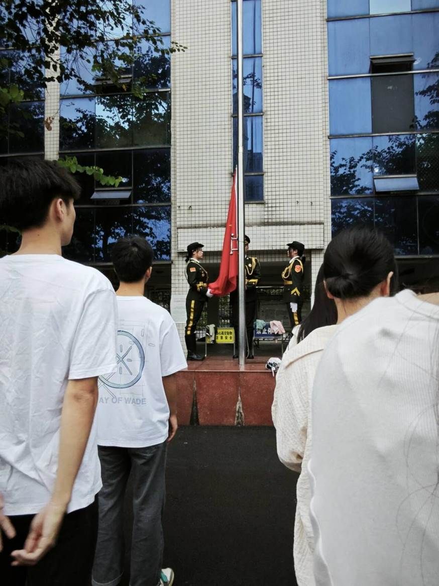 上午7:30,升旗仪式正式开始。学校国旗护卫队迈着铿锵有力的步伐,护送鲜艳的五星红旗入场。伴随着《义勇军进行曲》激昂的旋律,五星红旗冉冉升起,迎风飘扬。在场的每一个人都向国旗行注目礼,深怀着对祖国无限的热爱和崇高的敬意。