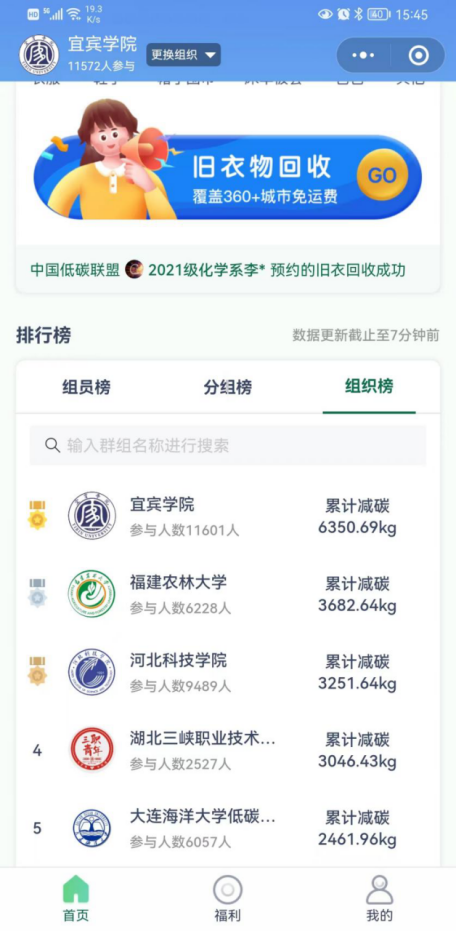 2022年6月13日~6月19日,共青团中央社会联络部、联合中国光华科技基金会面向全国百所高校组织发起“美丽中国·青春行动”校园绿色低碳周活动。宜宾学院积极响应号召,引导在校大学生积极参与节能减碳行动,做低碳生活的引领者、倡导者、实践者。截止到活动结束,我校参与人数达11417人,累计减碳量达6081.68g,居全国高校榜第一名!