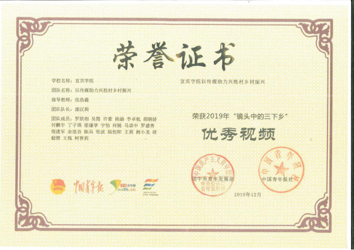 日前,宜宾学院农林与食品工程学部所拍摄的《龙镇乡形象宣传片》荣获共青团中央、中国青年报、中国青年网联合评选的2019“镜头中的三下乡”优秀视频奖(全国200个),伍浩淼老师荣获“优秀指导教师”(全省仅9人)称号,康汉莉同学荣获“优秀通讯员”(全国200名)。