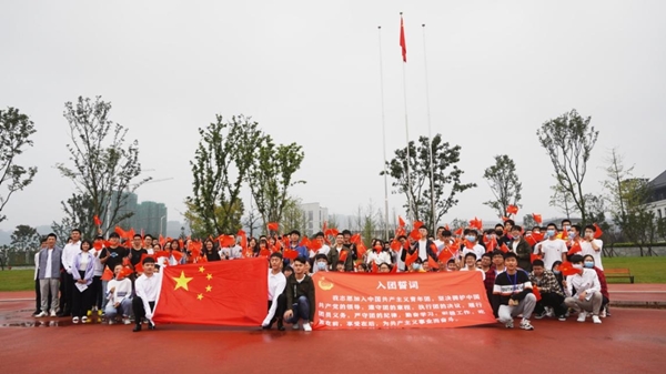 欣望江山千里秀,欢颂祖国万年春。当第一缕晨光照耀在鲜艳的红旗上,英姿飒爽的护旗手护送五星红旗进场。伴随着庄严的国歌,老师和同学们怀揣着对祖国的热爱和敬意,向迎风飘扬的红旗行注目礼。学生代表王贾蕊、张佳琦在国旗下发表了慷慨激昂的演讲,仪式在重温入团誓词中圆满结束。尽管思乡情深,但不少同学表示,即使因为疫情无法回家团圆,但在国歌声中,一股归家的暖意仍在心中流淌。