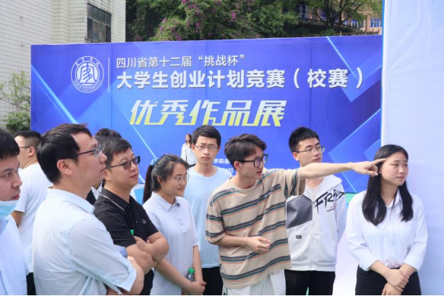 2022年5月11日,四川省第十二届“挑战杯”大学生创业计划竞赛(校赛)优秀作品展在A校区青春广场举行,本次作品展主要展出获得校赛一等奖的30个优秀作品,校团委主要负责老师带队,各学部(院)推荐一名教师(具有挑战杯赛事指导经验)作为评审组成员进行现场问辩。