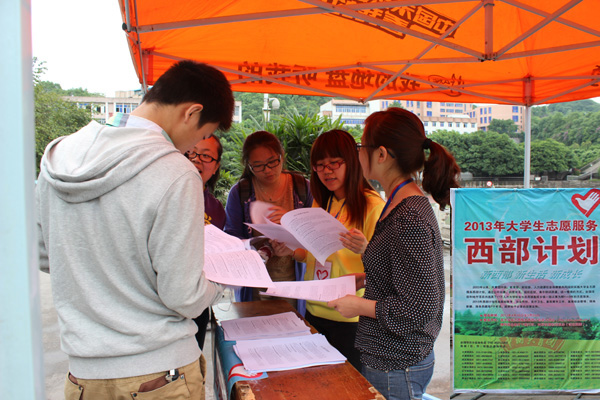 5月8日中午,我校青年志愿者总队在一平台、二平台分别开展了“2013大学生志愿服务西部计划”志愿者招募宣传活动。此次活动旨在帮助我校应届毕业生了解西部计划的相关政策,鼓励同学们积极投身于西部计划志愿服务工作。