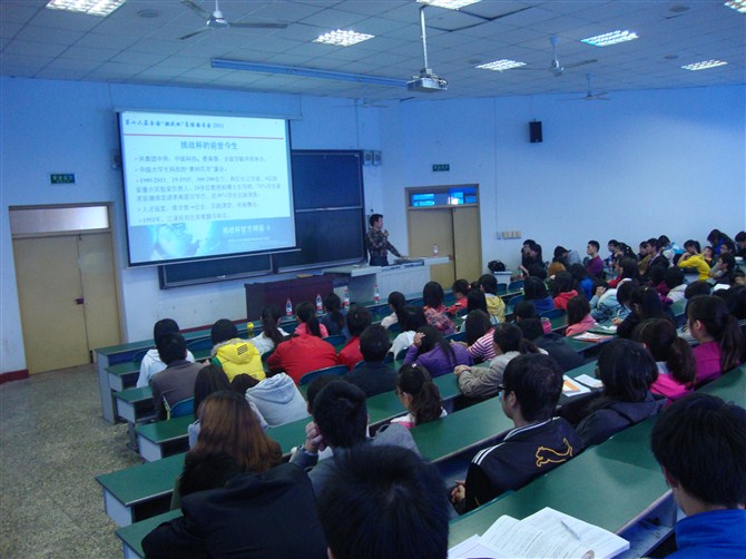 首先,尚教授为大家介绍了挑战杯的前世今生,让大家全方位的了解了挑战杯。接着,他为大家介绍了2011年第十二届挑战杯以及我校参赛作品的制作过程,并称其为“幸运的获奖之路”。随后,尚教授还谈到了参加挑战杯的作品及人需要满足的一些条件,分析了获奖作品的一些共性,为同学们解答了很多疑问。