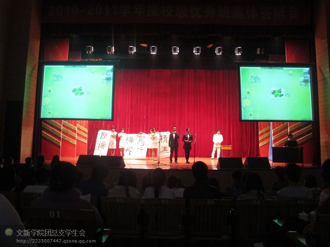 教师教育学院09级学前教育班结合自己专业特色,穿上自己制作的服装,体现了幼儿班的特色。政府管理学院09级3班的陈述方式则独树一帜,班级代表结合相声、京剧等艺术形式为大家展示班级成果和班级特色,博得阵阵喝彩。化工学院09级2班代表的出场词“父母生下你我,是化学反应的结果”在活跃现场气氛的同时凸显了专业特色。体育学院09级8班展示了优异的班级成绩,该班有多名市级、省级、国家级裁判员及其他成就,优异的成绩让同学们投以羡慕的眼光。文新学院09级2班的表现可谓让现场观众眼前一亮,不论是代表精彩激情的陈述还是现场书法书写我校校训“厚德、博学、笃学、精进”都赢得了热烈的掌声,该班还有舞蹈助阵,别具一格的表现形式给人留下深刻印象,更体现了一个班集体的优异与团结。精彩的现场表现加上平时的优异成绩让文新学院09级2班以9.11的高分夺得本次校级优秀班集体第一名。