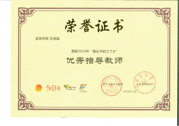 日前,宜宾学院农林与食品工程学部所拍摄的《龙镇乡形象宣传片》荣获共青团中央、中国青年报、中国青年网联合评选的2019“镜头中的三下乡”优秀视频奖(全国200个),伍浩淼老师荣获“优秀指导教师”(全省仅9人)称号,康汉莉同学荣获“优秀通讯员”(全国200名)。