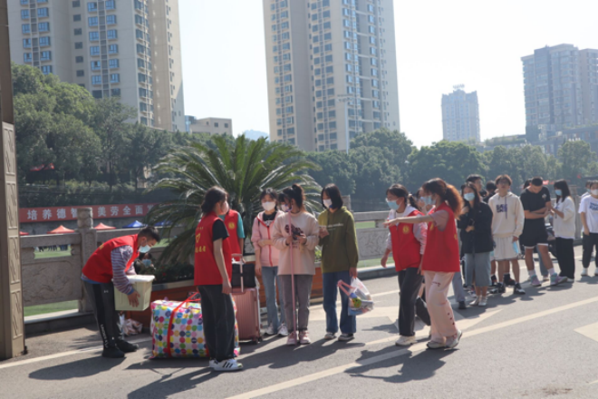 在统一安排部署下,志愿者们在校内外设点分工,如火如荼地开展返校和迎新工作,学校各部门师生志愿者们通力合作,到处都是忙碌的身影。后勤服务组在火车站、汽车站、校门口等地设立接待点,负责引导疏通人流;物业管理服务组负责教学楼、图书馆、实验室等场所的核酸查验、体温检测工作;师生服务组值守南北苑超市,负责指引、消毒、测量体温、核验双码等工作;核酸检测组维护现场秩序,协助医护工作人员核酸检测工作;学生会在新生咨询处热情细心地为新生指引方向,熟悉校园环境,帮助搬运和寄存行李,校园巴士往来穿梭于新生报到点和学生寝室之间,为同学们提供了极大的方便。