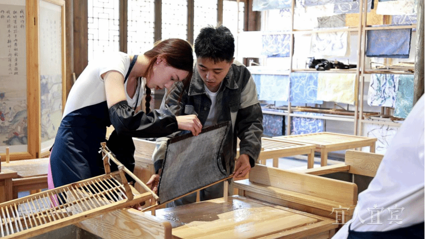 随后,研学团队前往李庄古镇,不仅领略到了古镇的秀美风光,还在李庄文化抗战博物馆了解到李庄在延续中国文脉方面作出的巨大贡献。在李庄古镇月亮田景区的打珠院研学基地,同学们“沉浸式”体验了以竹浆为主的古法造纸术,从实践体验过程中,窥见中国古代匠人们的智慧。在体验造纸术的过程中,宜宾学院国际经济与贸易专业大二的巴基斯坦留学生袁泰表示:“中国古人充满了智慧,能用竹子做纸,真的了不起!造纸虽然有些难,但尝试后觉得很有意思。”